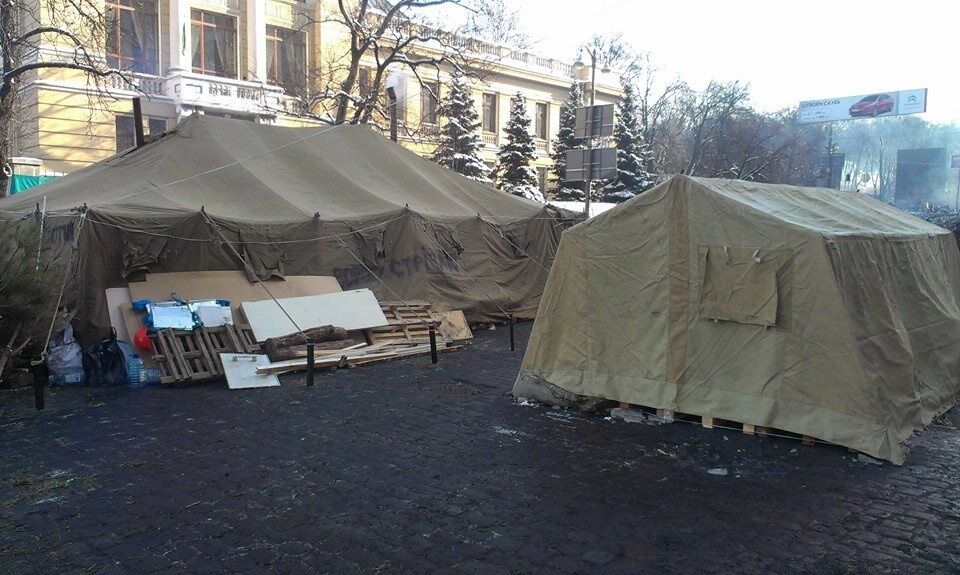 12.02 На Грушевского напротив Парламентской библиотеки митингующие разбили две палатки. В большей палатке разместилась вторая сотня самообороны Майдана.