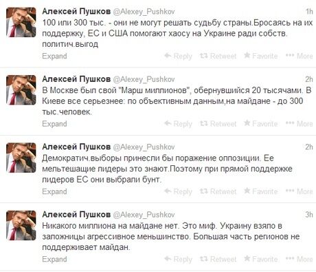 "В Москве был свой "Марш миллионов", обернувшийся 20 тысячами. В Киеве все серьезнее: по объективным данным, на Майдане – до 300 тысяч человек", – написал Пушков.