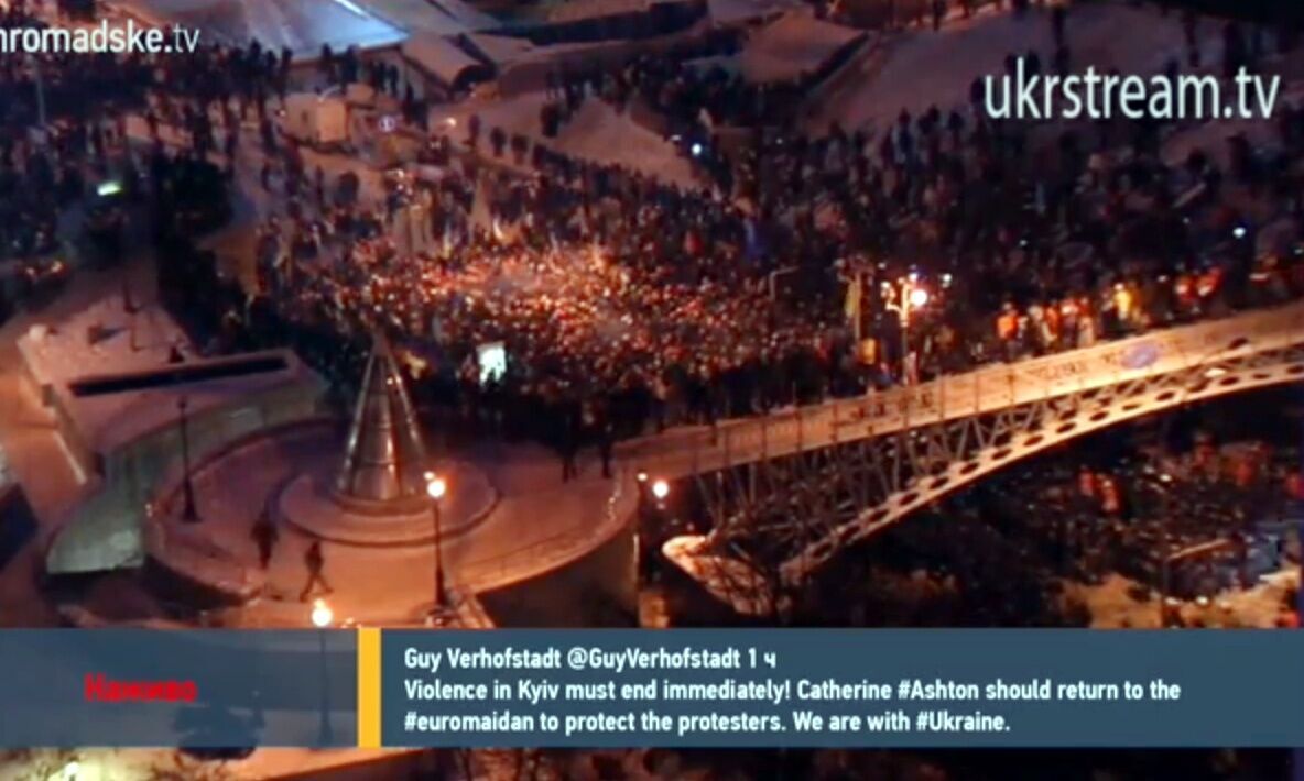 02.19 В социальных сетях активно публикуются просьбы подвезти на Евромайдан и номера телефонов. На улице Институтской видны вспышки.