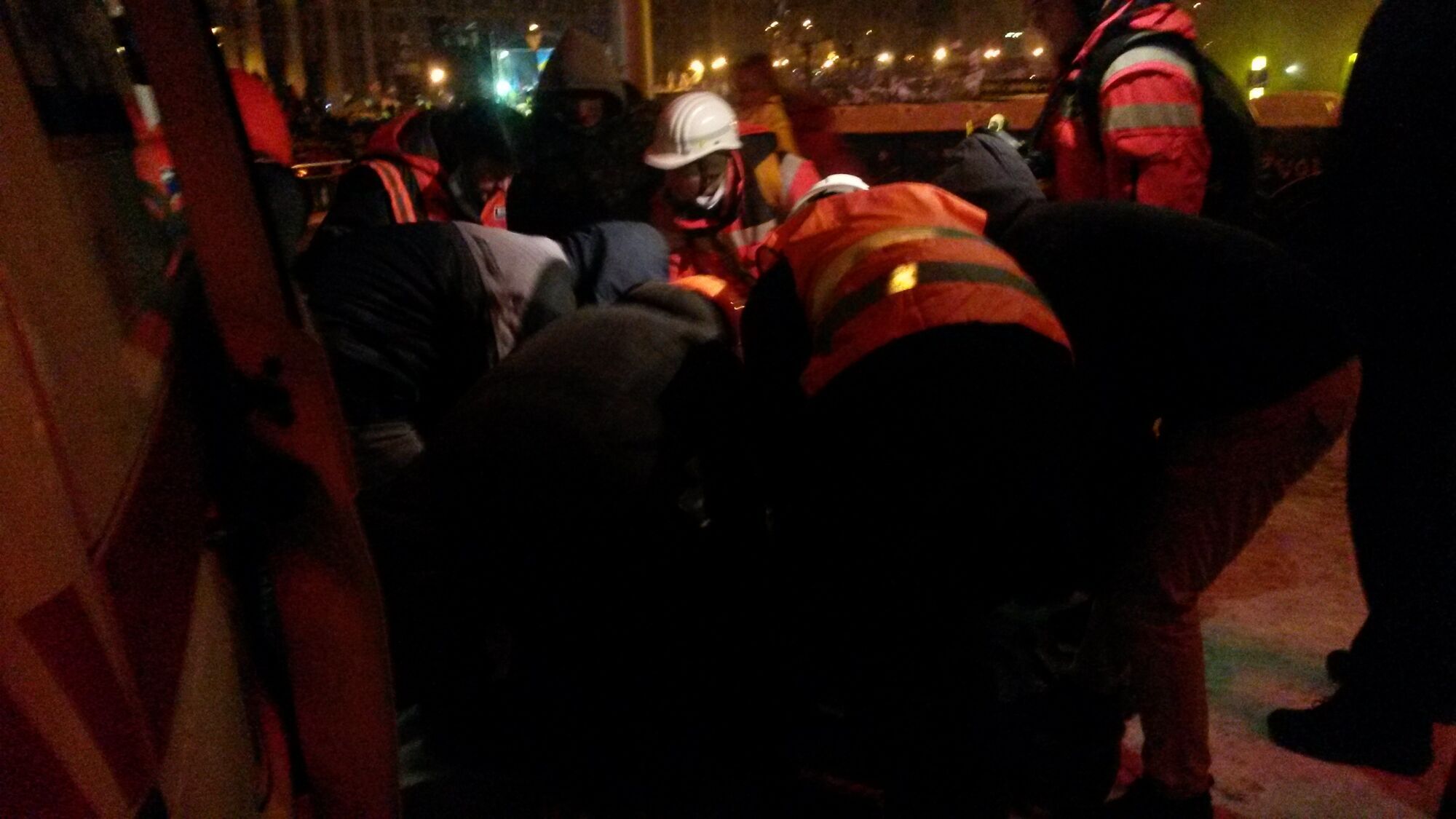 04.07 В давке на Институтской много кому становится плохо, одного из беркутовцев унесли на носилках. Митингующие – в оранжевых касках.