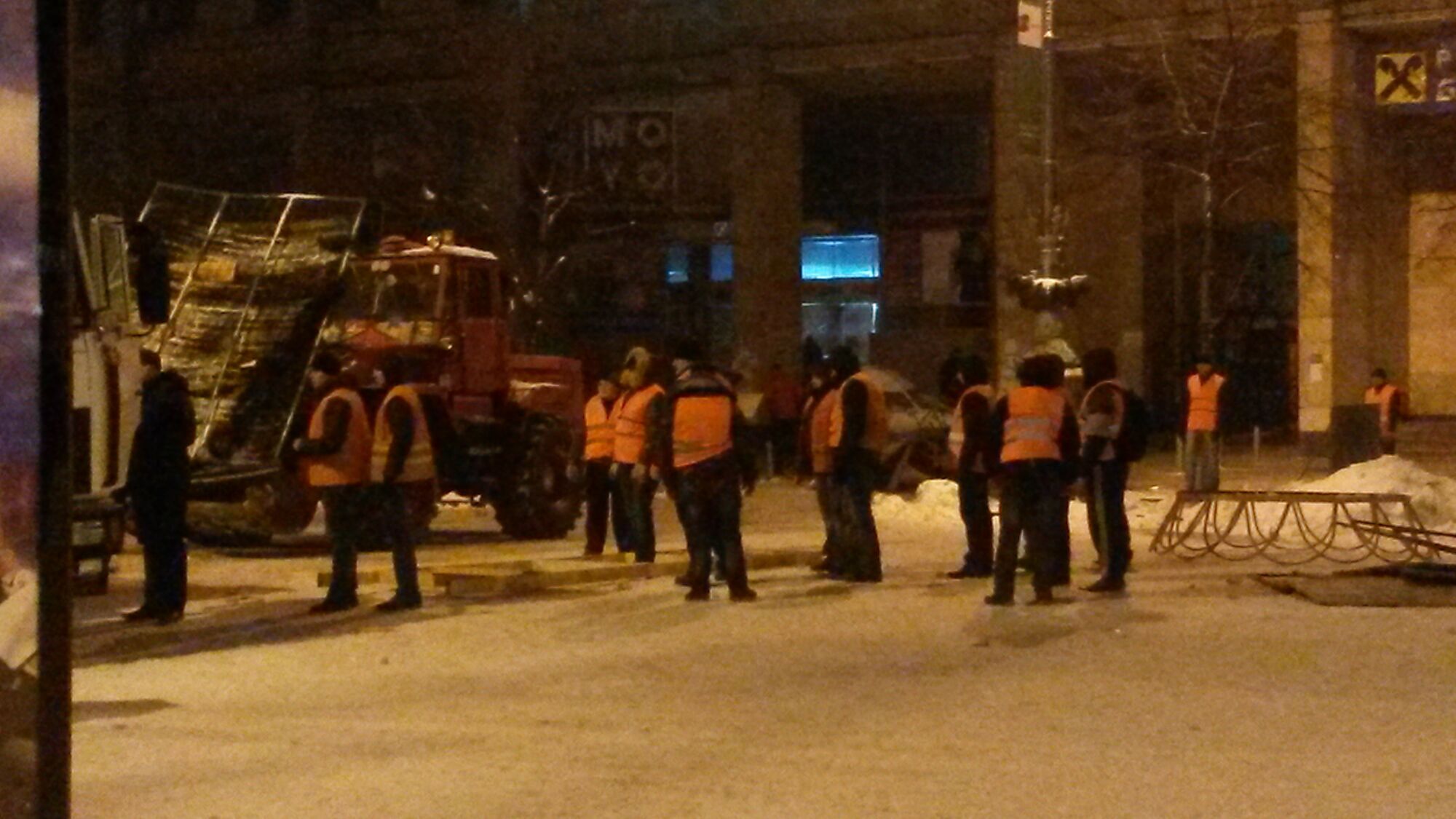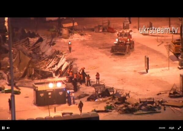 02.30 Сотрудники коммунальных служб зачищают баррикаду на Европейской площади.