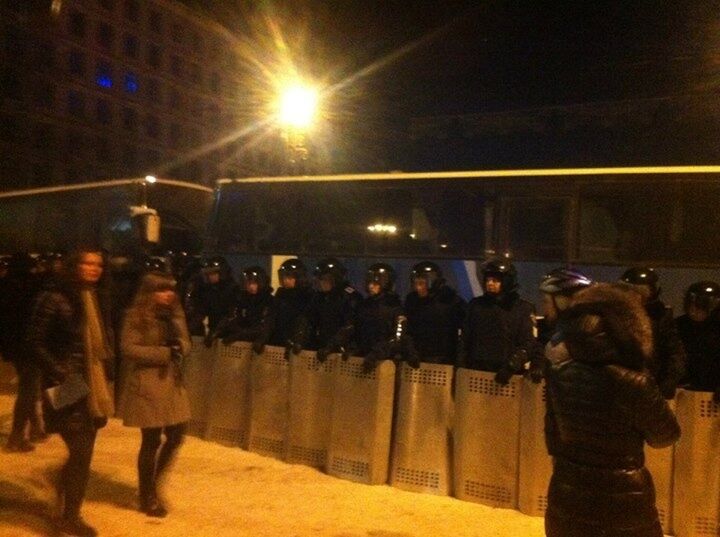 01.31 Нардепы пытаются вести переговоры с силовиками. Митингующие продолжают кричать "Мирный протест! Милиция с народом!" и поют гимн Украины. Онлайн-трансляция сообщает о приближении сотенной группы беркутовцев и внутренних войск. Подъезжают новые автобусы силовиков. На улице Пушкинской около восьми автобусов со спецназом.