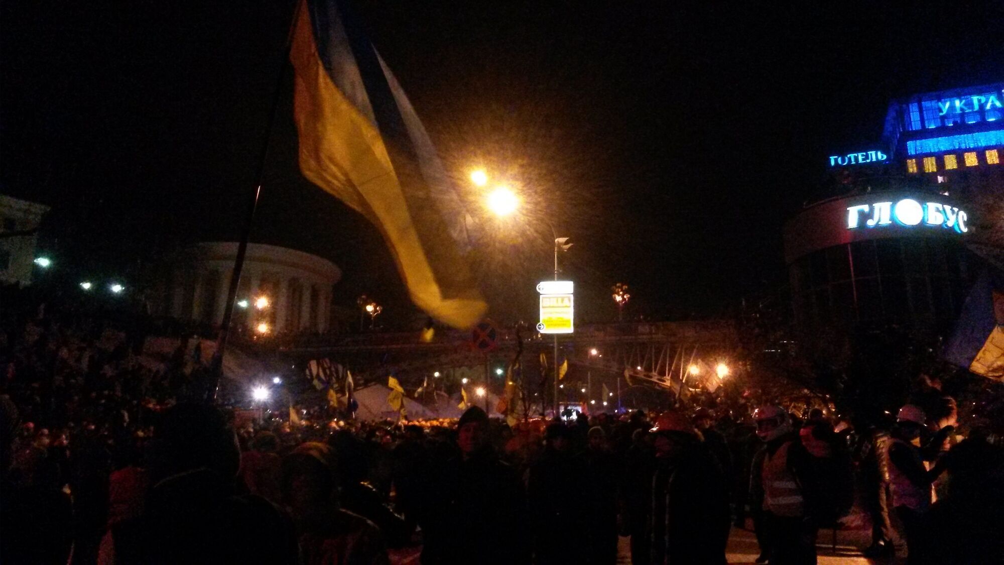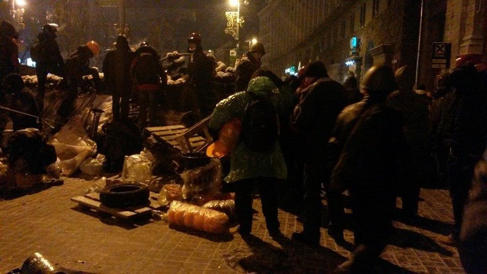 04.37 Провокация на Крещатике: 10-15 человек в гражданском, со свастикой на касках и монтировкой в руках, спустились с Прорезной, пытались распылить газ, однако их сумела вовремя остановить народная дружина Майдана.