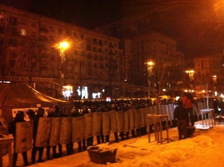 02.51 У КГГА выстроился "Беркут". По сообщениям соцсетей, штурм назначен на 3.00. На Майдане хором поют "Я не здамся без бою". Со второго этажа мэрии активисты поливают силовиков холодной водой.