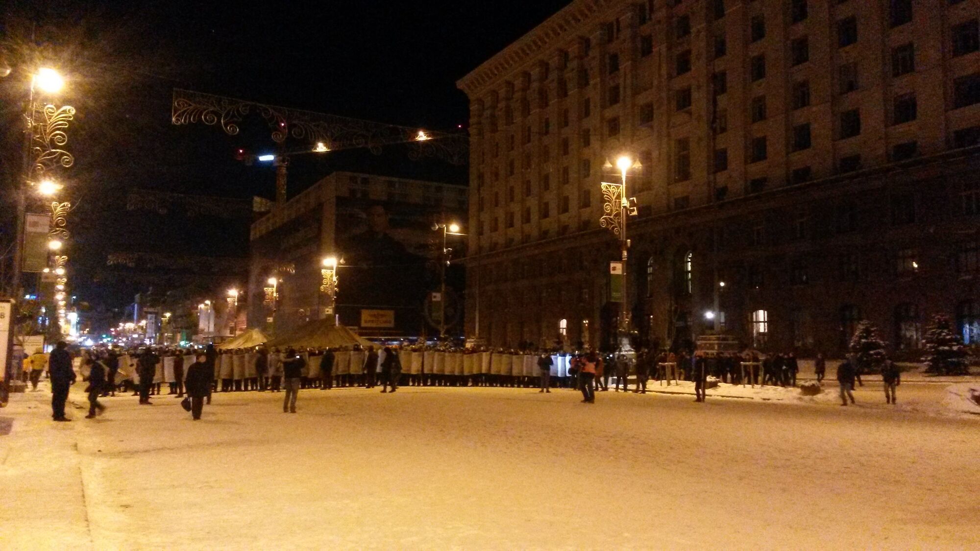 01.51 Баррикады со стороны Михайловской уже разобраны сотрудниками коммунальщиками. На Михайловской площади около 800-100 сотрудников внутренних войск и "Беркута".