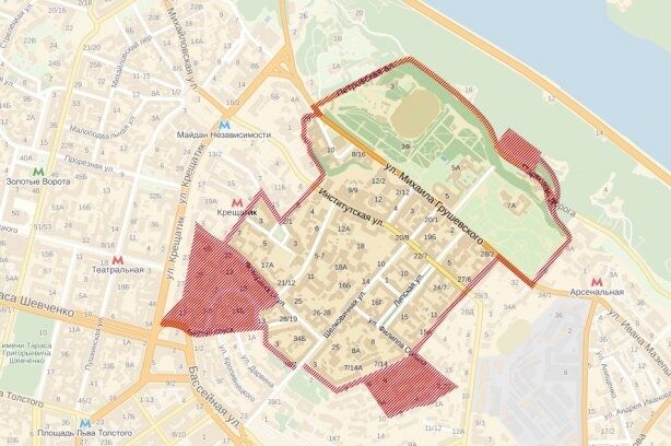 В список попали: перекресток улицы Орлика вдоль переулка Гордиенко; переулок Гордиенко к улице Академика Богомольца; улица Академика Богомольца до перекрестка с улицей Шелковичной; переулок Козловского до перекрестка с улицей Круглоуниверситетской; крутой спуск от переулка Козловского до Бессарабской площади; территория от Бессарабской площади по улице Круглоуниверситетской до перекрестка улиц Лютеранской и Заньковецкой; улица Заньковецкой от улицы Лютеранской до улицы Городецкого; улица Городецкого от улицы Заньковецкой до улицы Ольгинской; улица Ольгинская от улицы Городецкого до улицы Институтской; проезд от улицы Институтской до переулка Музейного; улица Грушевского от переулка Музейного к Петровской аллее.