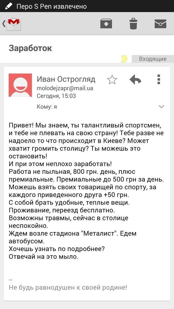 Многим спортсменам из города Харьков приходит неизвестная рассылка с приглашением ехать в Киев "останавливать громить столицу" за 800 гривен, сообщает издание "Главное".