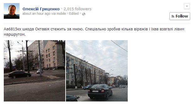 Один из лидеров Автомайдана, cын нардепа "Батьківщини" Анатолия Гриценко Алексей сообщил в своем Facebook, что за ним следит Skoda Octavia c номерами "АА 6815 КХ".