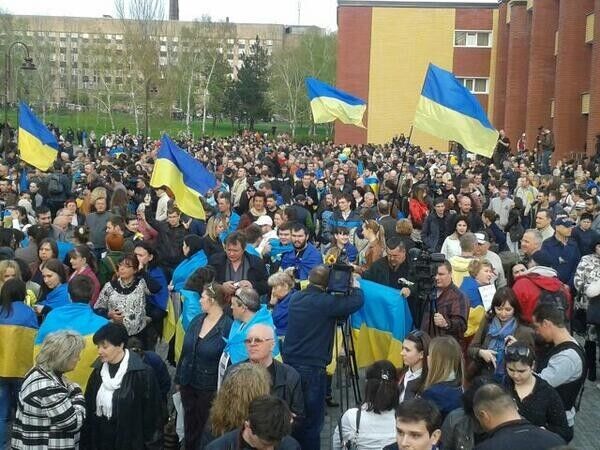 В центре города собралось около двух тысяч человек, люди продолжают приходить. Акция началась с молитвы "Отче наш". Люди с государственными флагами и украинской символикой скандируют "Донбасс – это Украина!".