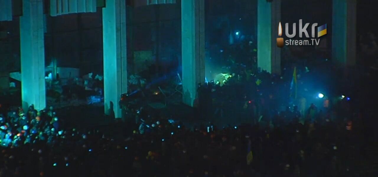 Сейчас Украинский дом осаждают около 1500 активистов, разбиты стекла, выломаны входные двери, постоянно раздаются выстрелы и взрывы шумовых гранат, уже применили слезоточивый газ. Митингующие бросают через разбитые стекла файеры, внутри ничего не видно из-за дыма. Протестующие требуют от милиции освободить здание, создали коридор для выхода.