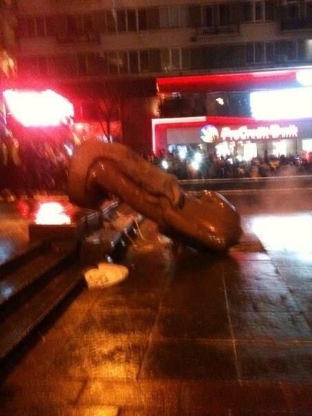 Памятник советскому вождю был повален группой митингующих вручную вечером 8 декабря после многотысячного марша протеста в Киеве.