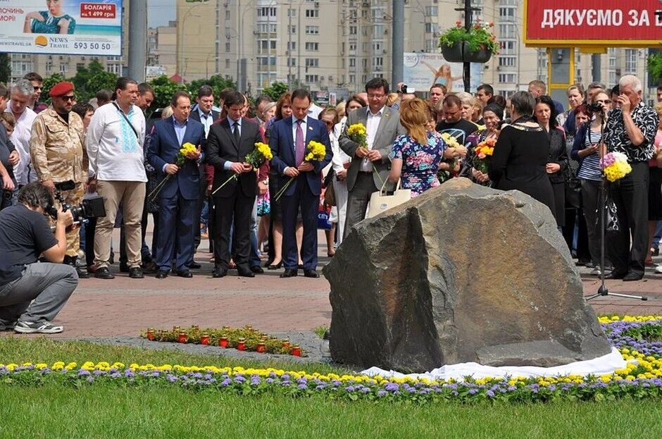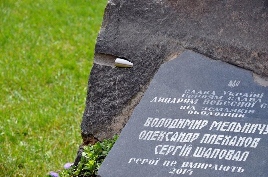 Сегодня в Оболонском районе Киева установили памятный знак в честь героев Небесной сотни - оболонцев. Памятник представляет собой камень с вошедшей в него пулей и табличкой. На ней написано: "Рыцарям Небесной сотни от земляков оболонцев". Он посвящается Владимиру Мельничуку, Александру Плеханову и Сергею Шаповалу. На церемонии присутствовали родители погибших и известные украинские политики.