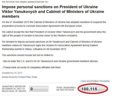 Обращение, в котором содержится просьба к Белому дому санкции против президента Украины Виктора Януковича за отказ от заключения Соглашения об ассоциации с ЕС, подписали уже более 100 тысяч человек.