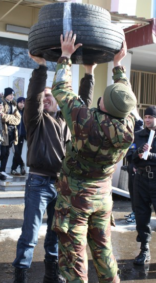 Евромайдановцы-олимпийцы метали брусчатку и копья на меткость, перетягивали канат, а также поднимали и перекатывали автомобильные шины.