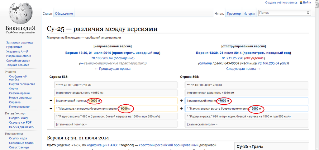 После его заявления статью о Су-25 в "Википедии" попытались отредактировать, вписав высоту боевого применения 9000 метров и потолок в 10000 метров. Однако редакторы онлайн-энциклопедии отменили внесенные правки.
