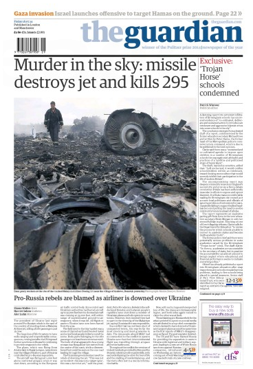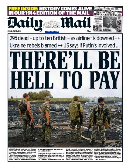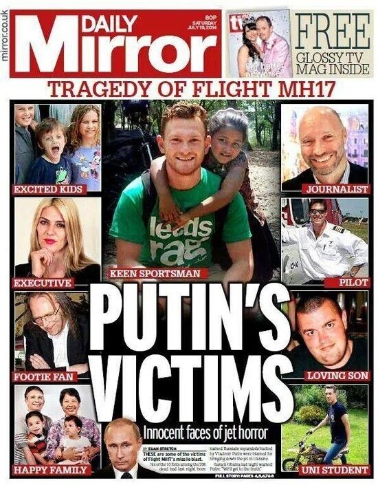 Журналисты не спешат вешать ярлыки, ведь международное расследование крушения Boeing 777 только началось. Некоторые издания, как британский The Guardian, заострили внимание на погибших, американский The National Interest назвал свой номер за июль и август 2014 года "Россия возвращается", а английская ежедневная газета озаглавила номер угрозой президенту РФ Владимиру Путину расплатой за содеянное.