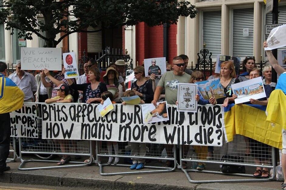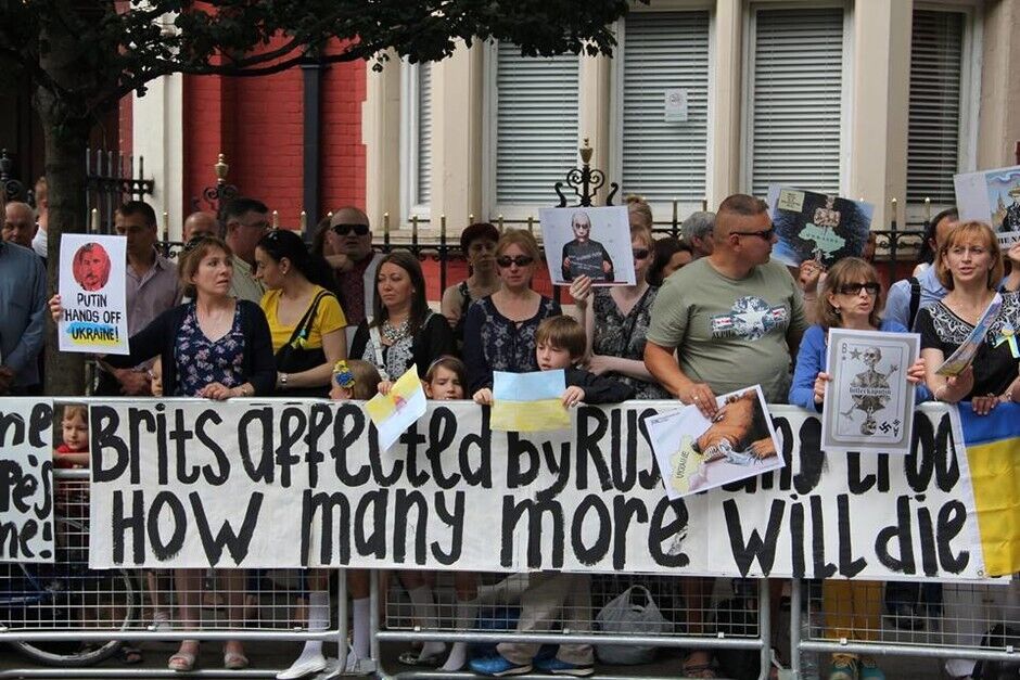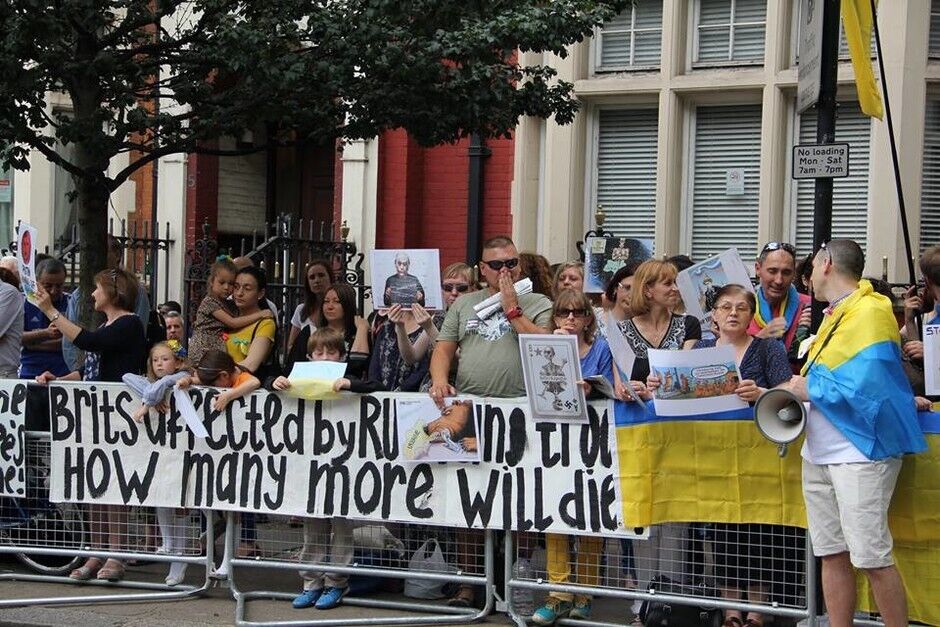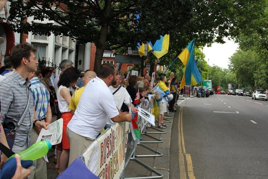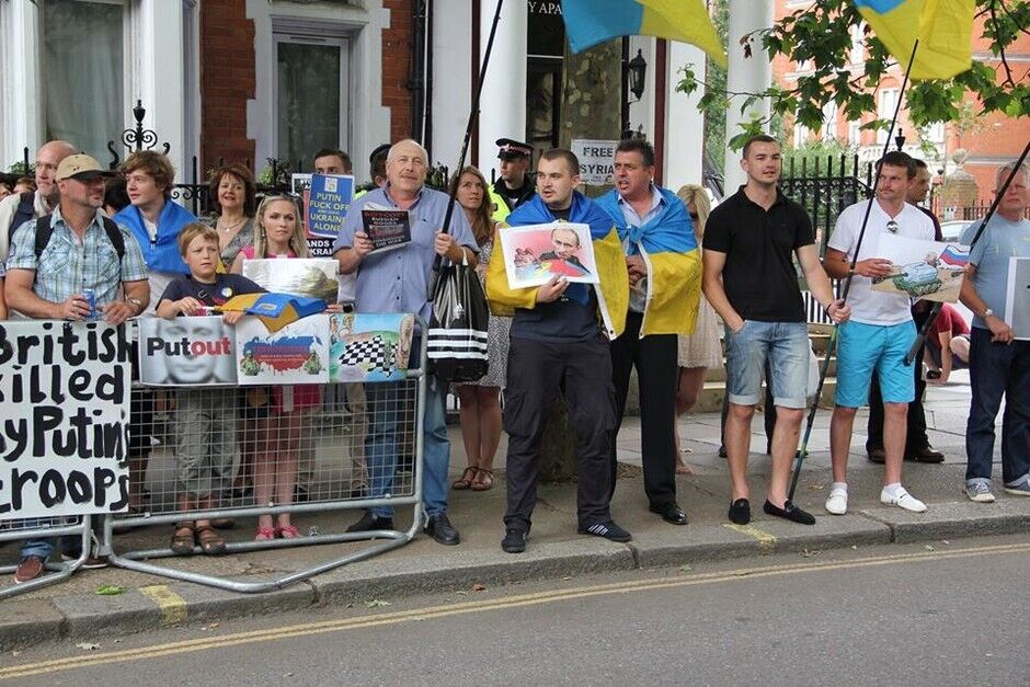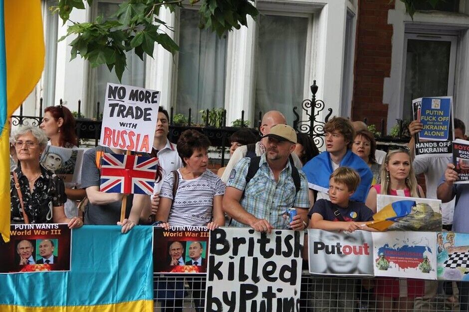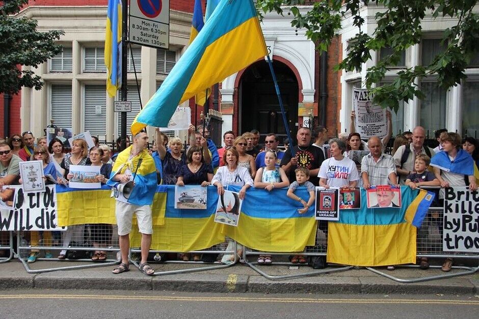 В воскресенье, 20 июля, под посольством России в Лондоне украинцы вместе с британцами и представителями других национальностей провели акцию протеста против президента РФ Владимира Путина и вооруженных пророссийских боевиков на востоке Украины. Митингующие требовали введения новых санкций против Кремля.