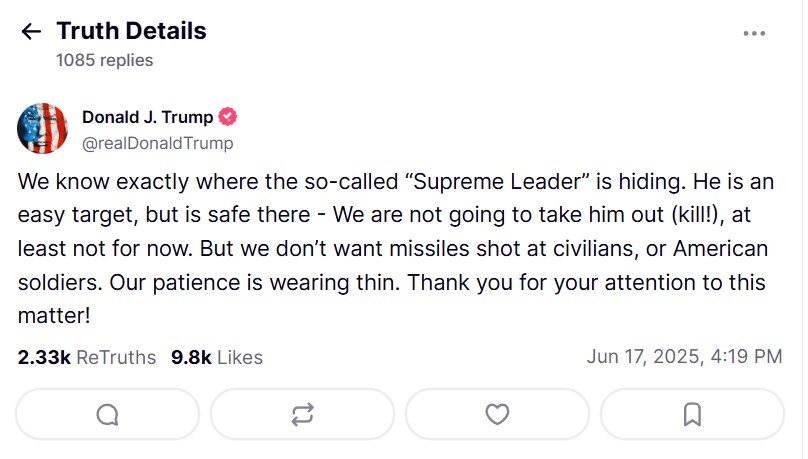 "Мы точно знаем, где скрывается так называемый верховный лидер [Ирана]. Он – легкая мишень, но там он в безопасности, мы не собираемся его убирать (убивать!), по крайней мере сейчас. Но мы хотим, чтобы ракеты не стреляли по мирным жителям или американским солдатам. Наше терпение лопается", – написал Трамп.