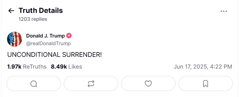 Позже глава Белого дома опубликовал еще одно сообщение по поводу конфликта с Ираном. "Безусловная капитуляция!" – написал Трамп.