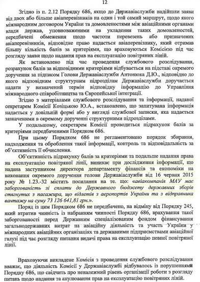 Комиссия, которая проводила расследование, рассматривала ситуацию с МАУ на заседании 26 июня 2015 года. Главной темой обсуждения стала объективность процедуры по предоставлению прав на эксплуатацию воздушных линий.