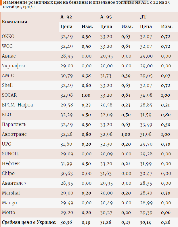 В сетях АЗС WOG и ОККО бензин марки А-92 подорожал на 50 коп./л, до 32,49 грн/л, а марки А-95 – на 63 коп./л, до 33,20 грн/л. ДТ подорожало на 72 коп./л, до 32,07 грн/л. В сети AMIC цены на бензины и ДТ повысились на 38–67 коп./л. SOCAR увеличила стоимость бензинов в среднем на 0,63–1 грн/л, а Shell – на 60–72 коп./л.