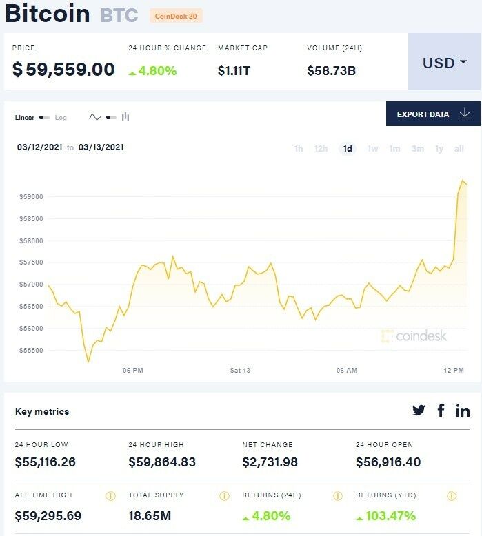 Стоимость биткоина 13 марта превысила отметку в $59 тыс. Об этом свидетельствуют данные криптовалютной биржи Coindesk.
