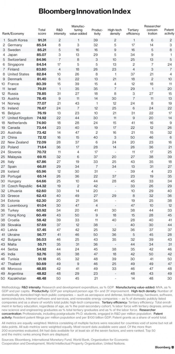 Bloomberg оценивает "уровень инновационности" по семи критериям: научно-исследовательские работы, добавленная стоимость производства, продуктивность предприятий, технологичность и эффективность компаний, концентрация исследователей и количество зарегистрированных патентов.