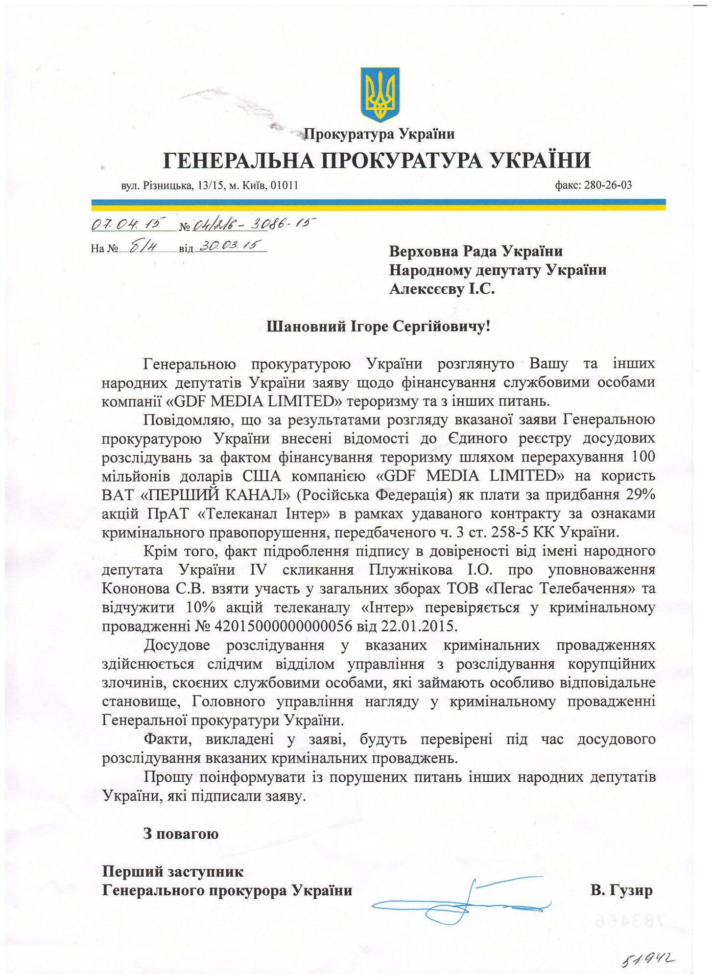 В документе отмечается, что в Единый реестр досудебных расследований внесены сведения по факту финансирования терроризма путем перечисления компанией "GDF Media Limited" $100 млн в пользу российского "Первого канала" в качестве платы за приобретение 29% акций телеканала "Интер" .