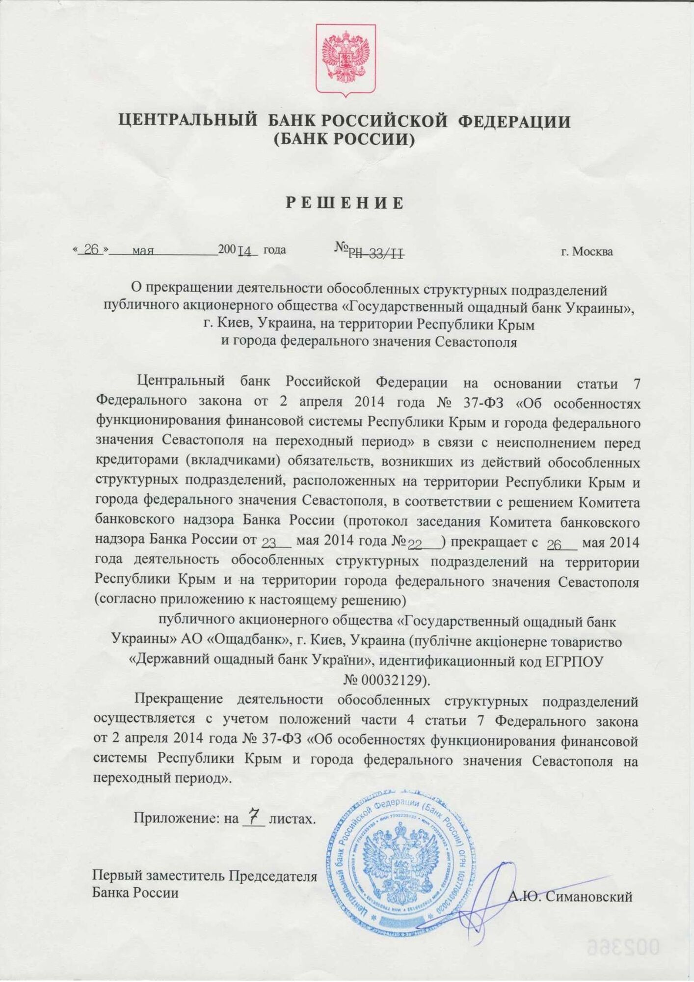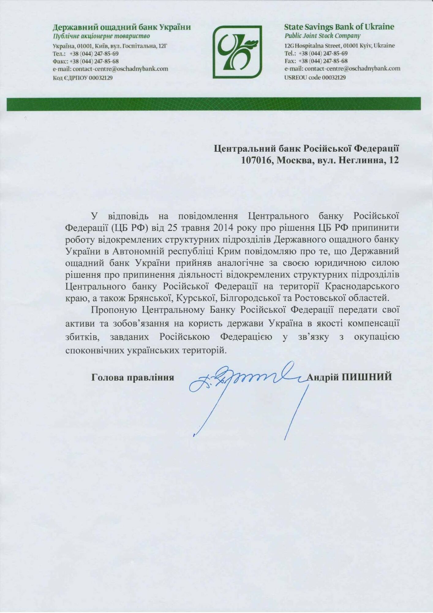 26 мая Пышный получил уведомление от российских властей, о том, что деятельность отделений "Ощадбанка" в Крыму приостановлена.
