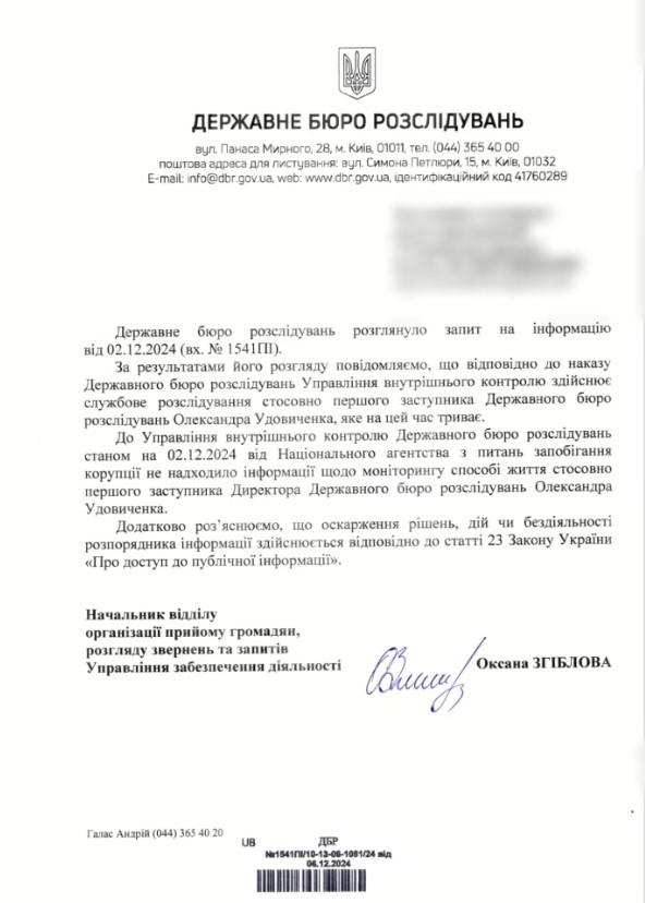 В ответе на запрос УП представители ГБР отметили, что по состоянию на 2 декабря в управление внутреннего контроля ГБР от Национального агентства по вопросам предотвращения коррупции (НАПК) не поступало информации о соответствующем мониторинге.