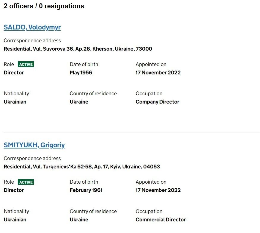 Информация об этой компании опубликована на правительственном портале Великобритании. В профайле сказано, что она была зарегистрирована 17 ноября 2022 года. Соучредителем компании вместе с Сальдо указан еще один бывший регионал, экс-нардеп Григорий Смитюх.