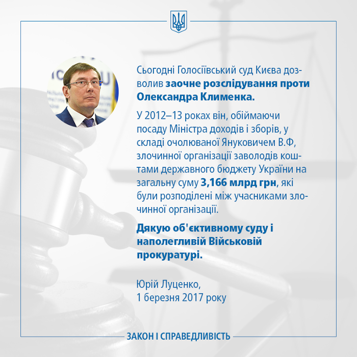 Луценко: Суд дал разрешение на проведение заочного расследования в отношении Клименко