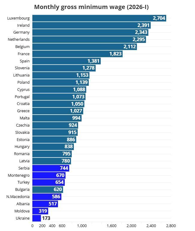 В целом, около 12,8 млн работников в 22 странах ЕС получают минимальную зарплату или меньше. При этом почти треть из них не увидела повышения к январю 2026 года. При этом даже в странах с низкими доходами внутри ЕС минимальная зарплата значительно выше украинской: в Болгарии она составляет €620, в Румынии – около €795, в Венгрии – €838.