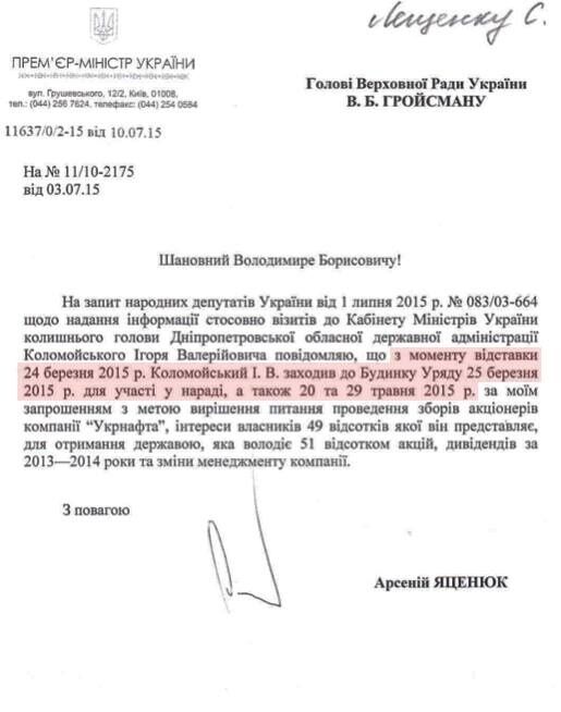 Украинский бизнесмен Игорь Коломойский после отставки с поста главы Днепропетровской облгосадминистрации по крайней мере трижды приходил в Кабмин. Об этом на своей странице в Facebook написал народный депутат Сергей Лещенко. Он опубликовал скан ответа Яценюка на депутатский запрос.