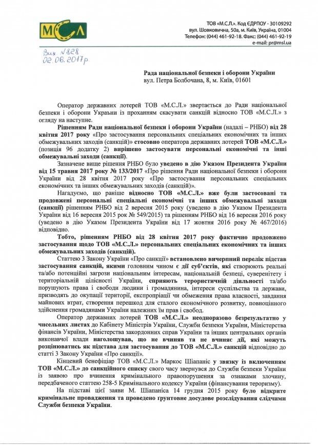Оператор государственных лотерей "М.С.Л." потребовал от СНБО исключить компанию из санкционного списка