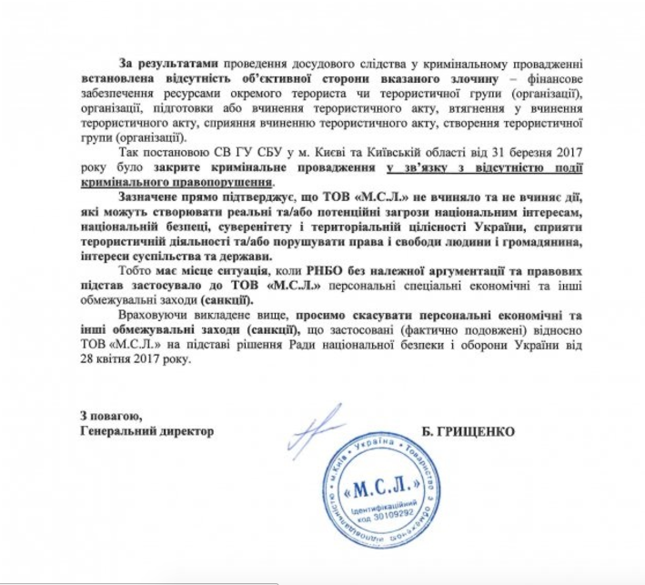 Слободниченко отметила, что Служба безопасности Украины по инициативе акционеров компании открывала уголовное производство и провела расследование, чтобы выяснить, есть ли основания для применения к ООО "М.С.Л." санкций. Юрист заявила, что это уголовное производство было закрыто в марте 2017 года в связи с отсутствием таких оснований.