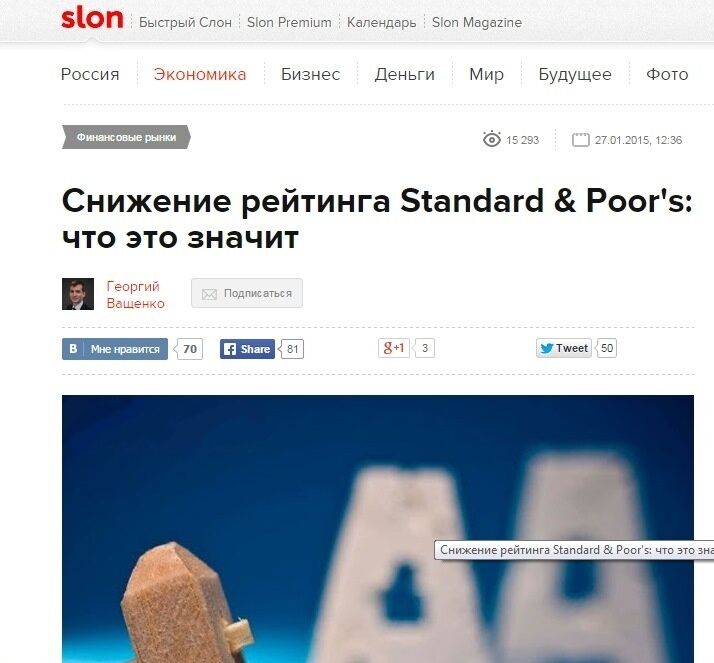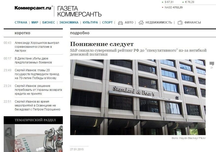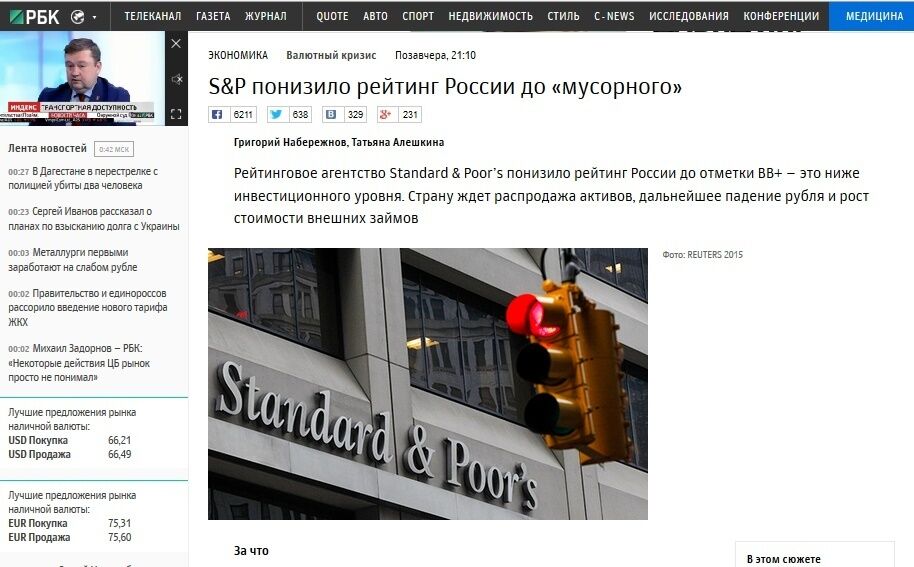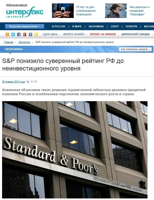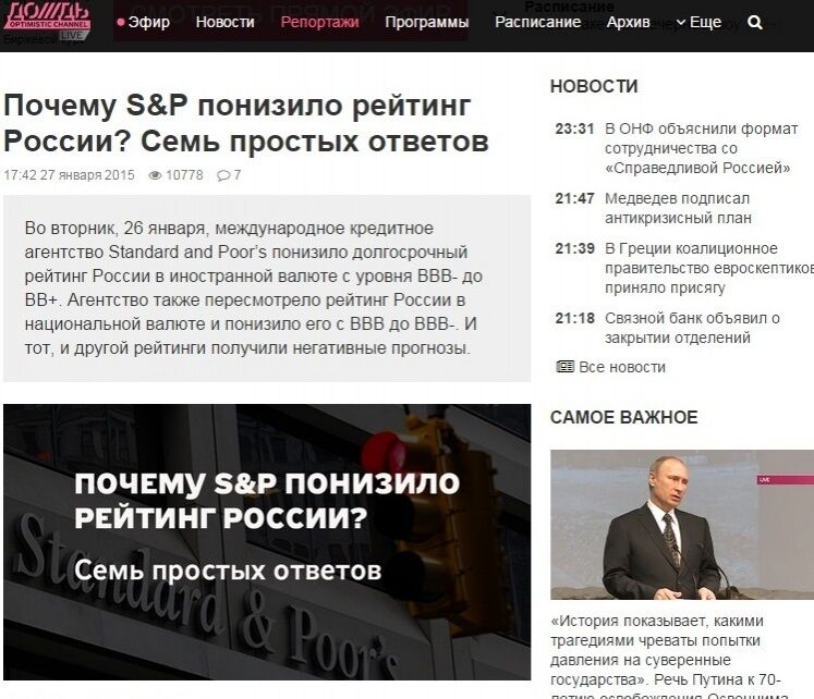 На сайте российского информационного телеканала Дождь появилась статья под заголовком "Почему S&P понизило рейтинг России? Семь простых ответов". Издание пишет, что ничего хорошего российскую экономику не ожидает.