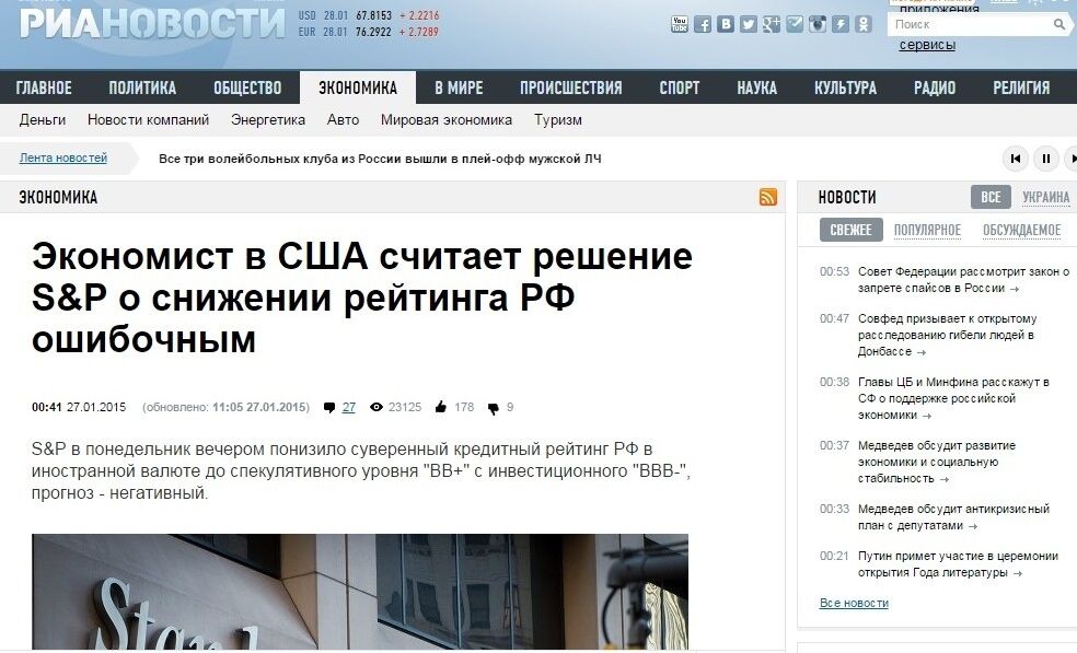 Российское информационное агентство РИА выпустило материал "Экономист в США считает решение S&P о снижении рейтинга РФ ошибочным". В статье американский экономист Джеймс Рикардс заявил, что снижение российского рейтинга "бессмысленное" и "неправильное". Экономист предположил, что Россия могла бы одолжить у Китая на все, что ей потребуется.