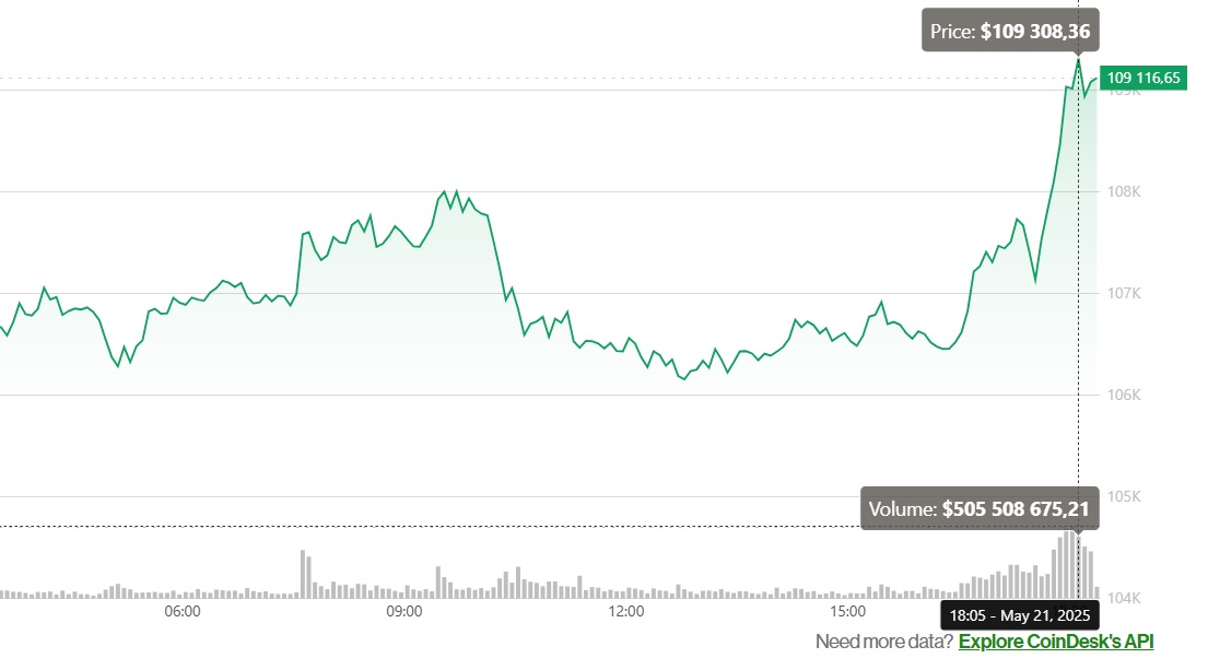 Выше отметки в $109 тыс. стоимость криптовалюты поднималась несколько раз после 17.55 среды.