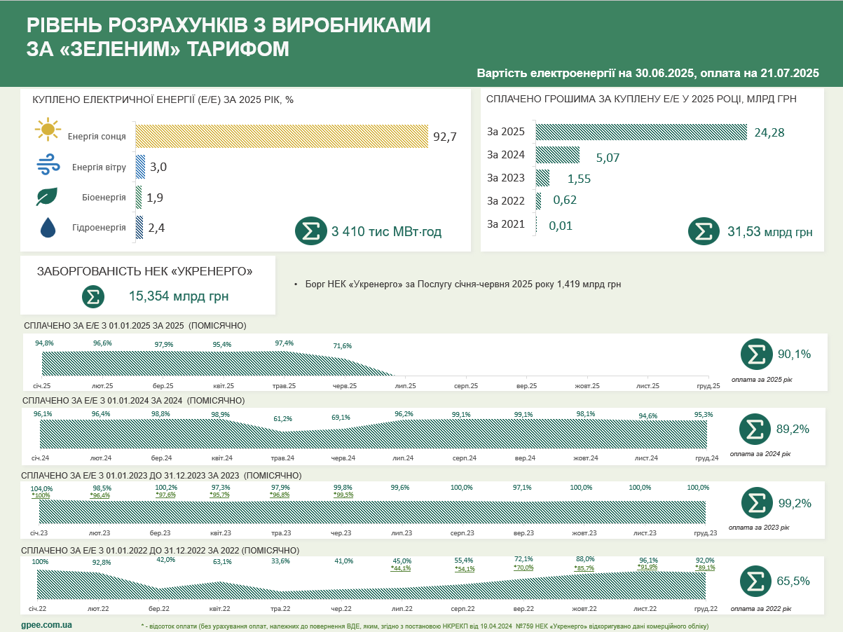 Уровень расчетов "Гарантированного покупателя" перед производителями "зеленой" энергии с начала 2025 года составляет 90,1%, за 2024 год – 89,2%, за 2023 год – 99,2%.