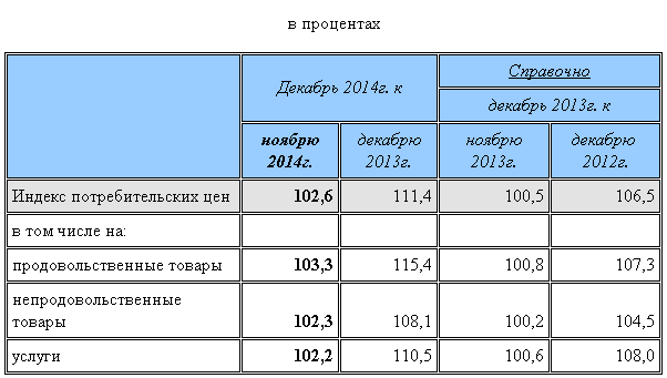 Согласно данным Федеральной службы государственной статистики (Росстат) РФ, опубликованным на официальном сайте ведомства, цены на продовольствие в России по итогам 2014 года выросли на 15,4%.
