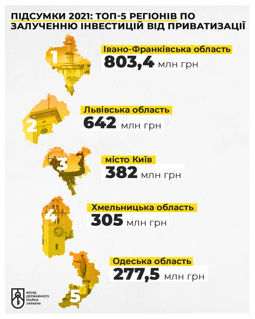 "В 2021 году Ивано-Франковская, Львовская области, Киев, Хмельницкая и Одесская области вошли в рейтинг топ-5 регионов по привлечению средств от малой приватизации, который подготовил Фонд государственного имущества Украины. Лидер рейтинга – Ивано-Франковская область – [...] с результатом 803,4 млн грн заняла первое место среди самых успешных областей", – говорится в сообщении.