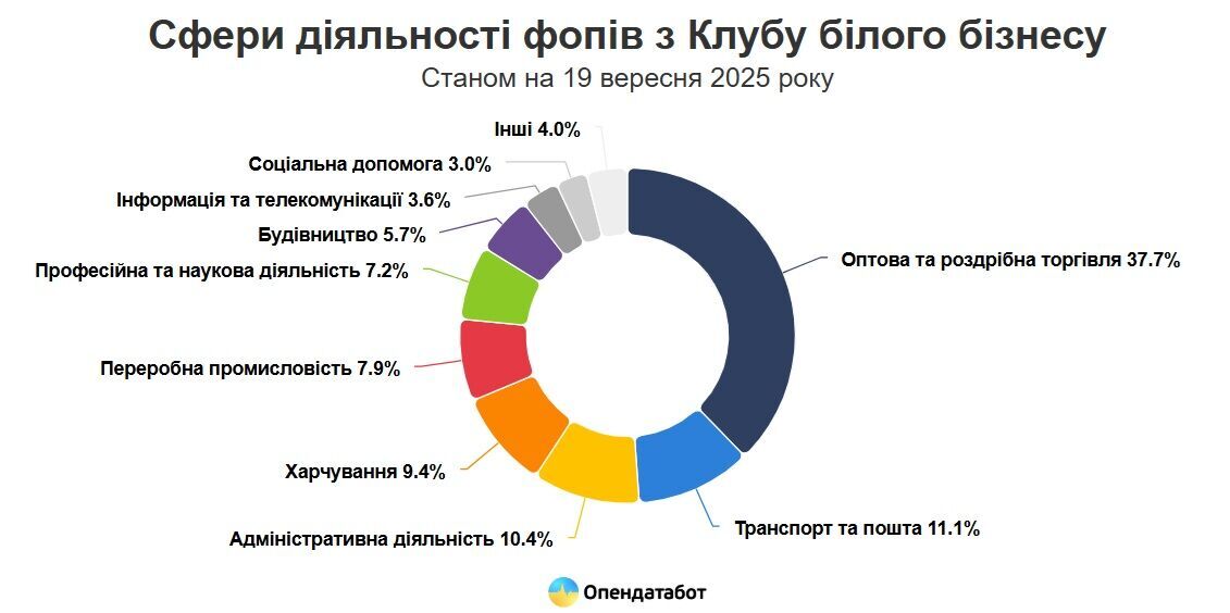 "Самой популярной сферой деятельности ФЛП является торговля – 200 предпринимателей, или 38%. За ней следуют транспорт и логистика (11%), админуслуги (10%) и сфера питания (9%)", – проинформировали в сервисе.