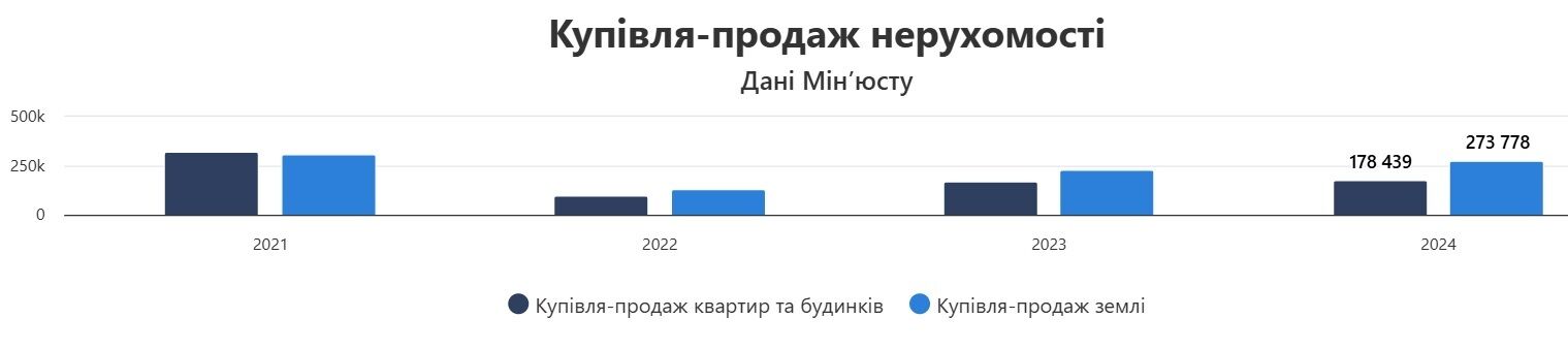 "Рынок недвижимости восстанавливается, но украинцы выбирают вкладываться в землю. 452 217 договоров купли-продажи недвижимости засвидетельствовали нотариусы в 2024 году. [...] Это на 12% больше, чем в 2023 году, однако все еще на 28% меньше, чем до полномасштабного [вторжения РФ в феврале 2022 года]", – говорится в сообщении .