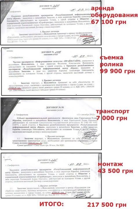 Крымский правозащитный центр "Действие" опубликовал в сети видео с достопримечательностями города Судак, на которое по документам было потрачено 217,5 тыс. грн. По данным властей, съемки ролика обошлись в 99 тыс. грн, еще 67 тыс. грн стоила аренда оборудования. Монтаж и услуги по транспортировке были оценены в 50 тыс. грн.