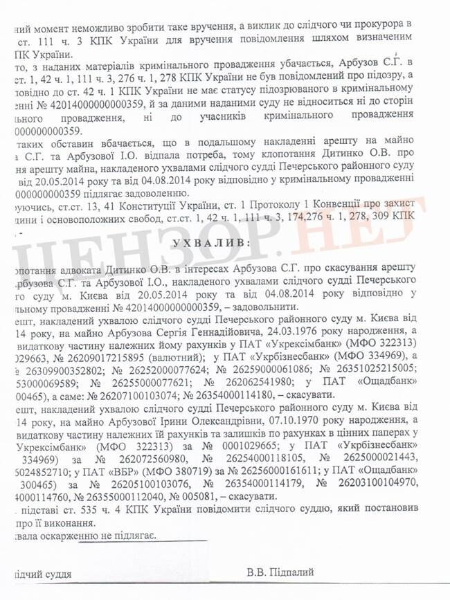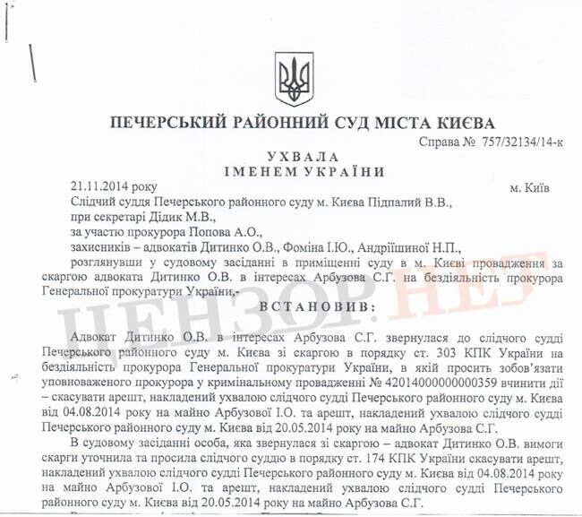 21 ноября Печерский районный суд Киева вынес решение о снятии ареста с имущества семьи главного финансиста семьи Януковича, бывшего первого вице-премьер-министра Сергея Арбузова.
