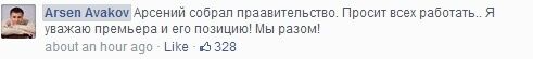 Премьер-министр Арсений Яценюк собрал правительство и просит всех работать, написал в Facebook глава МВД Арсен Аваков.