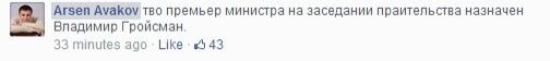 "Временно исполняющим обязанности премьер-министра на заседании правительства назначен Владимир Гройсман", – написал Аваков.