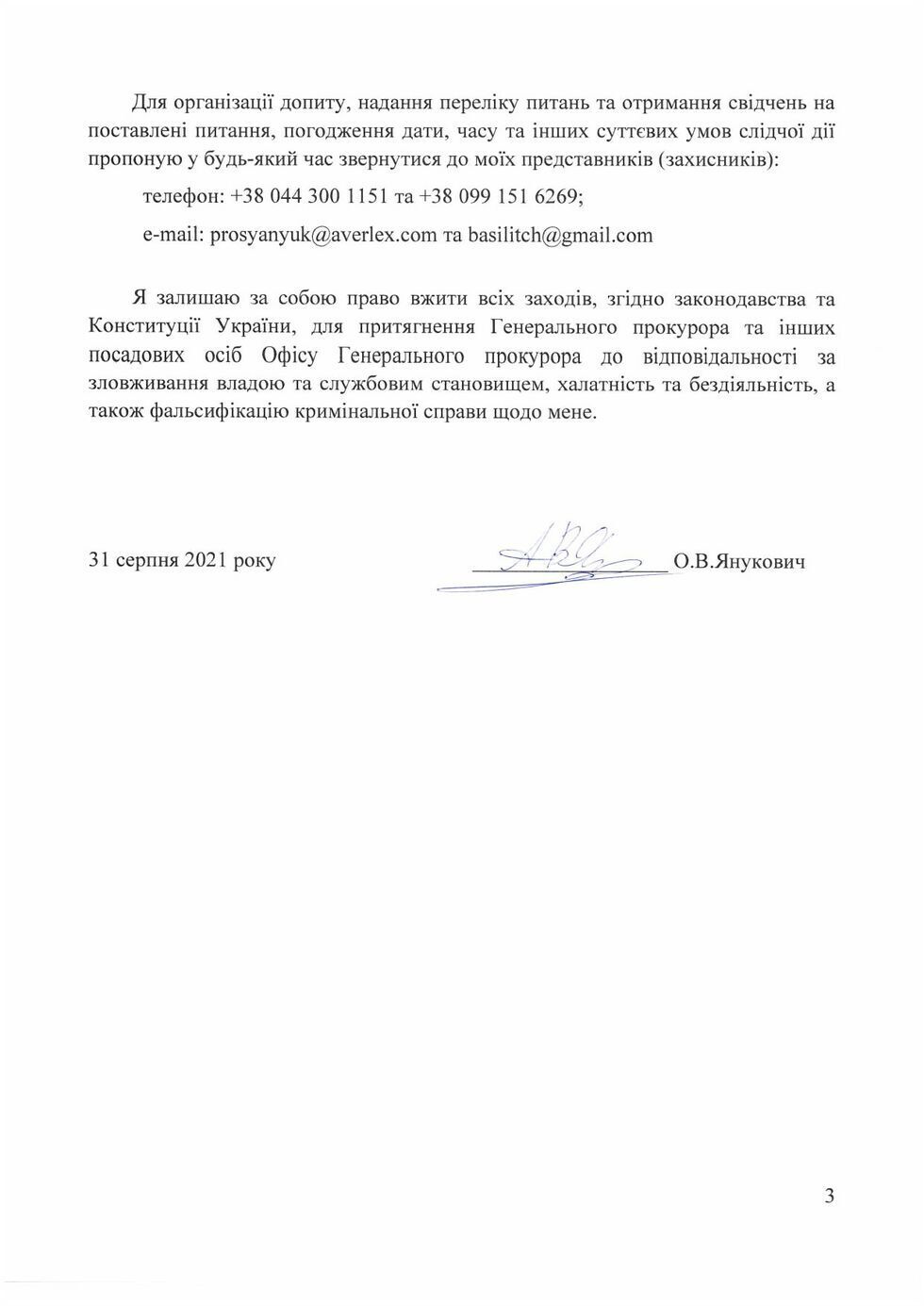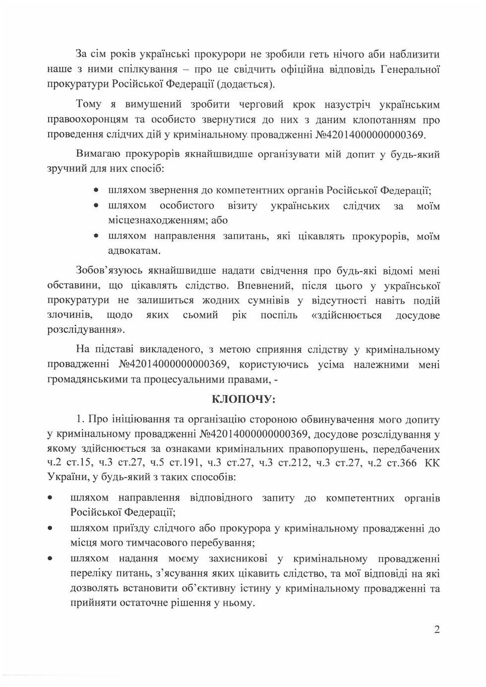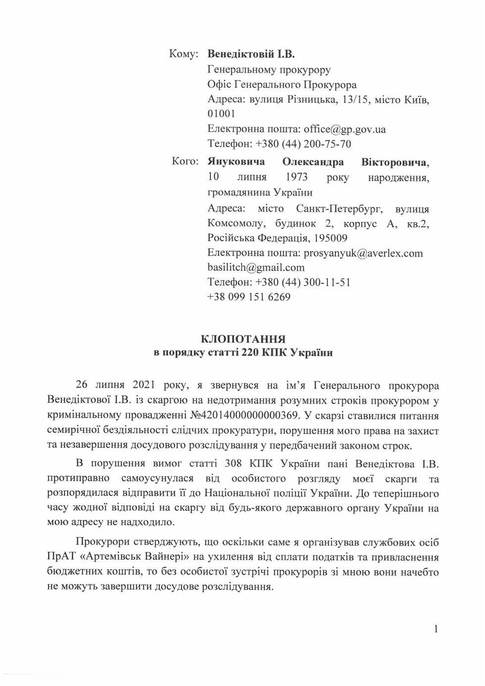 "Александр Янукович направил в Офис генерального прокурора ходатайство о проведении следственных действий в отношении него в уголовном производстве №42014000000000369 о якобы уклонении от уплаты налогов ЧАО "Артемовск Вайнери". Это очередная попытка Александра Януковича сдвинуть с мертвой точки "расследование", которое длится уже более семи лет. Прокуроры утверждают, что без допроса Александра Януковича они якобы не могут завершить досудебное расследование, поэтому он требует как можно скорее организовать такой допрос в любом из форматов", – написал пресс-секретарь и опубликовал ходатайство.