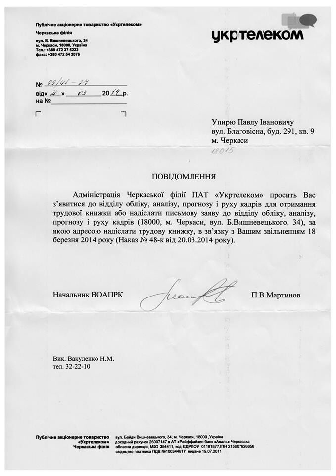 "Я снова публично обращаюсь к руководству ОАО "Укртелеком", которое убеждало, что не увольняет мобилизованных резервистов. Вот факт", — написал он, указывая на уведомление об увольнении, которое получил резервист Павел Упырь.